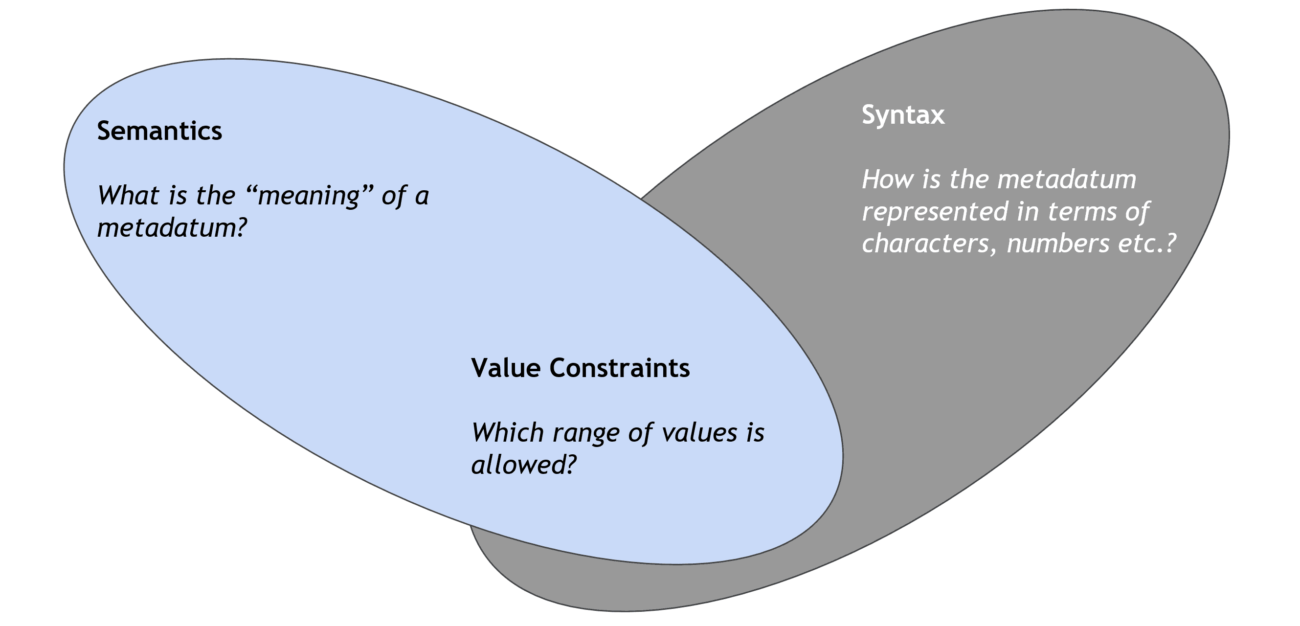 • Hand in Hand mit der Frage der Beschreibungsdimension eines Metadatums geht die Definition, welche Werte bzw. Wertebereiche bei der Verwendung dieses Metadatums zulässig sein können, zumal die Semantik eines Metadatums hier Einschränkungen bedingt. So wird beispielsweise ein Metadatum, das sich auf ein Datum bezieht, ein standardisiertes Datumsformat wie ISO 8601 als Wertebereich festlegen.