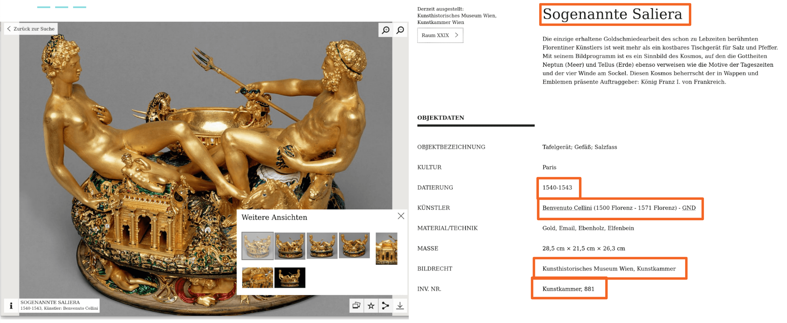 Abbildung 4: Metadaten in einer Detailansicht der “Cellini-Saliera” in der Online-Sammlung des Kunsthistorischen Museums. Screenshot: Daniel Schopper, CC-BY-4.0