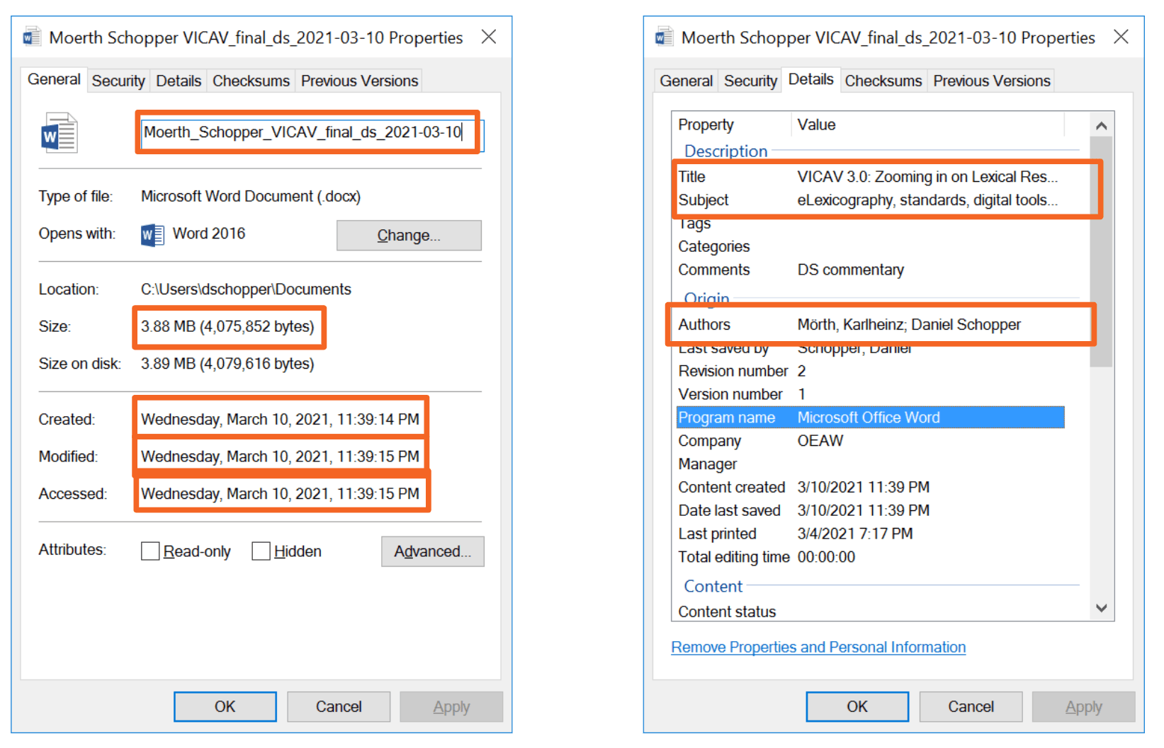Metadaten gibt es beispielsweise über die Daten auf unserem Computer. Hier haben wir es mit Dateien in einem Dateisystem zu tun. Diese Dateien liegen in bestimmten Ordnern, auf festgelegten physischen Laufwerken. Sie haben eine Größe, verschiedene Datumsangaben, Angaben zu Autor*innen, und sogar beschreibende Angaben wie den Titel, Thema usw. In der Regel beschreiben die Metadaten in unseren Dateisystemen Eigenschaften der physischen Datei und ihrer Entstehung bzw. Bearbeitung. Schlagwörter, Inhaltsangaben etc. beziehen sich hingegen auf den Inhalt, die semantische Ebene einer Datei wie z.B. eines Word-Dokuments.