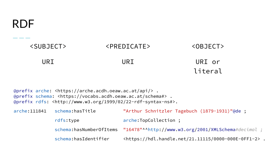 Abbildung 9: Aufbau und Beispiel von RDF in den ARCHE Metadaten. Bild: Daniel Schopper, CC-BY-4.0