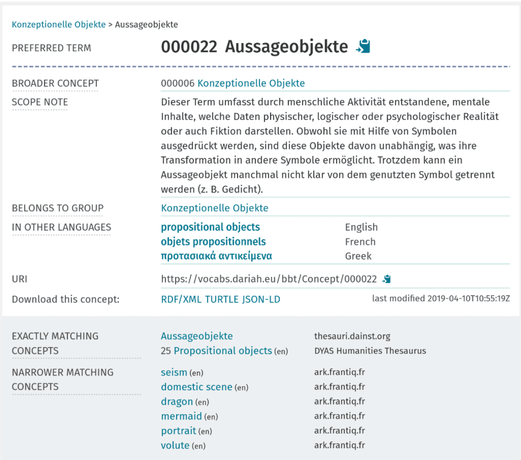 Abbildung 7: Screenshot des Konzepts “Aussageobjekte” aus dem DARIAH BBT. Bild: Daniel Schopper, CC-BY-4.0
